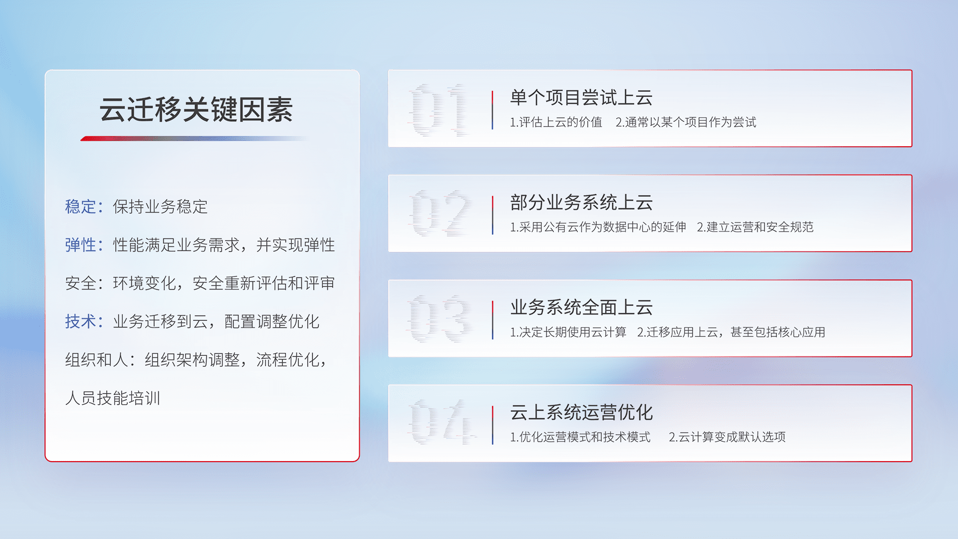 结合实际业务,,,从规划设计、、、云平台选型、、、云原生改造、、、、数据迁移、、集成交付,,迁移全过程为客户识别最佳上云路径,,做好风险识别管理,,,设计网络架构、、、身份权限、、安全审计合规、、、操作审计、、、、日志审计、、、监控告警策略、、多站点容灾设计等,,,对云上基础设施进行整体规划,,提升IT治理水平,,以满足弹性、、高可用、、、高性能的需求。。