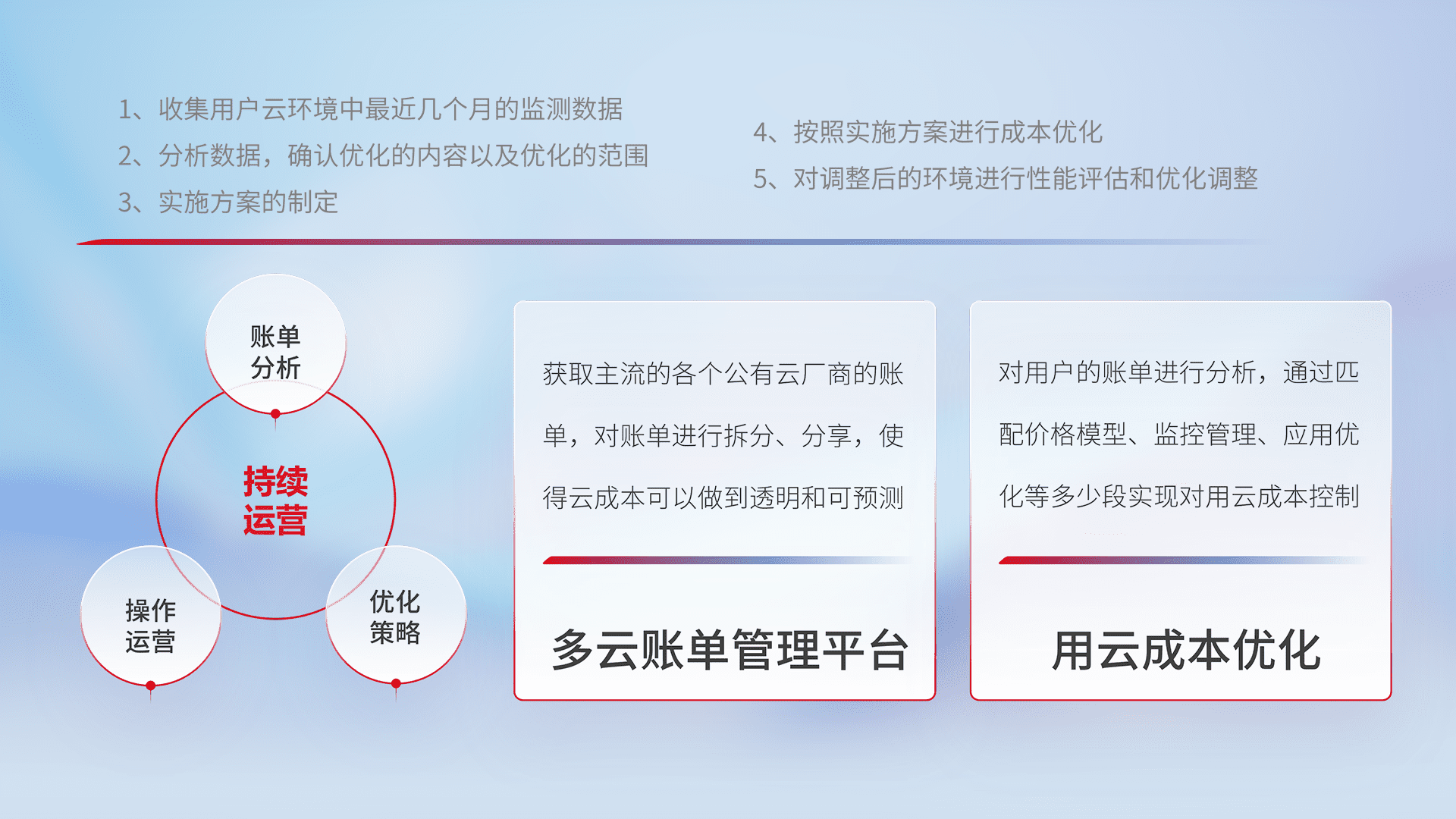 通过多云纳管,,以统一的资源数据模型把客户的云资源进行抽象和封装,,,,进而实现对多云资源的统一操作,,保障云资源管理的可靠性、、稳定性与可用性。。。。量身定制化运维内容,,,,配置、、、、开发运维、、、补丁管理、、、、备份、、监控、、认证和访问管理、、、、审计和日常巡检等,,,,保障在用云过程中的可靠度,,,稳定度以及高可用率。。